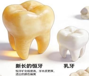恒牙的最外层牙釉质更透明,而牙釉质下的牙本质是淡黄色的。乳牙的最外层牙釉质较厚且更不透明,遮盖了下面的颜色。所以当恒牙长出时,更透明的牙釉质让牙本质的黄色更容易显现出来。