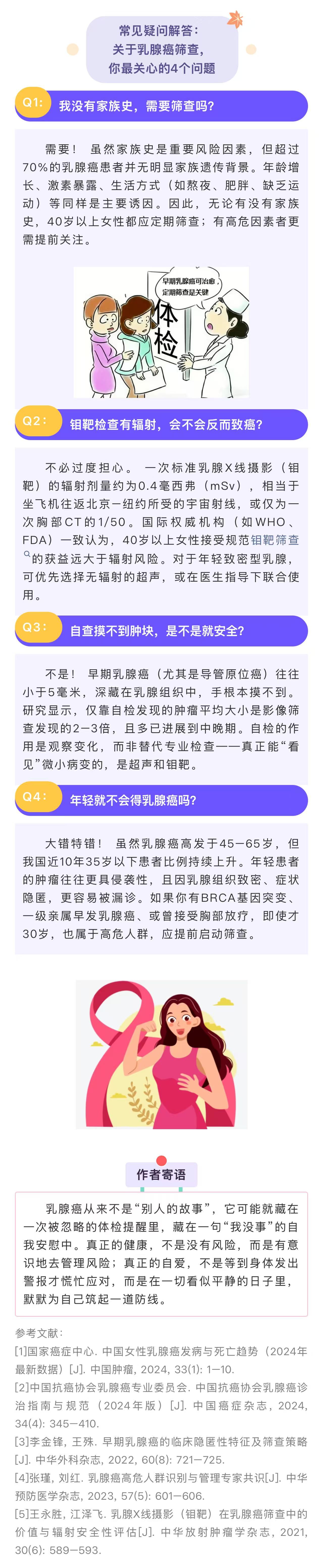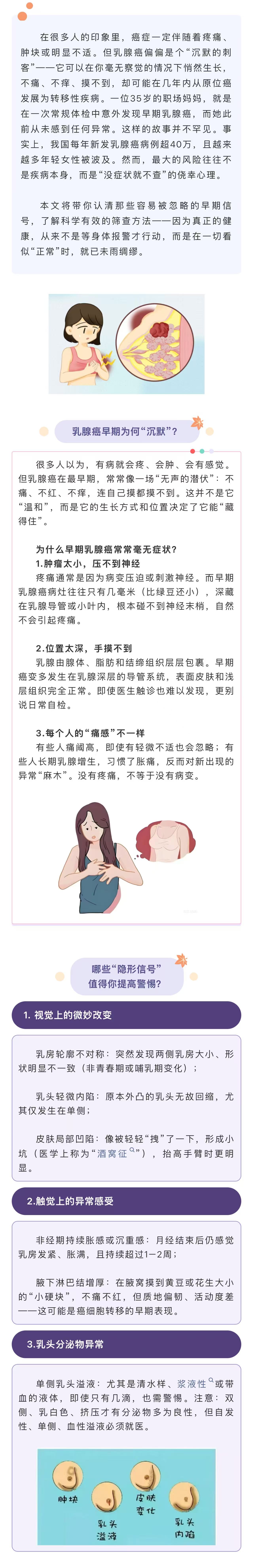 图文简介: 本文将带你认清乳腺癌容易被忽略的早期信号,了解科学有效的筛查方法——因为真正的健康,从来不是等身体报警才行动,而是在一切看似“正常”时,就已未雨绸缪。