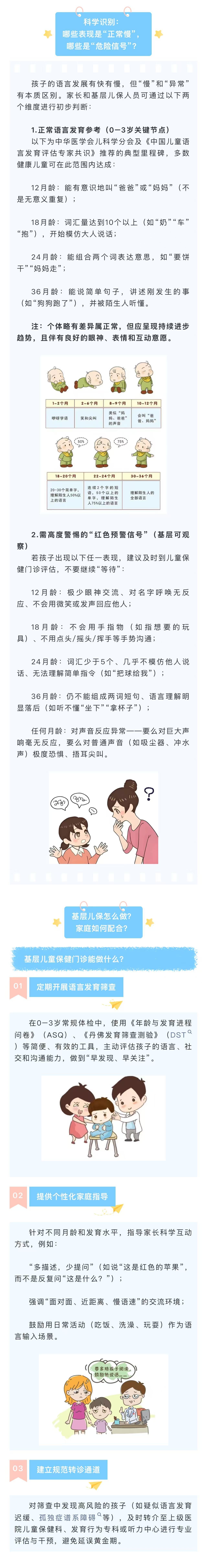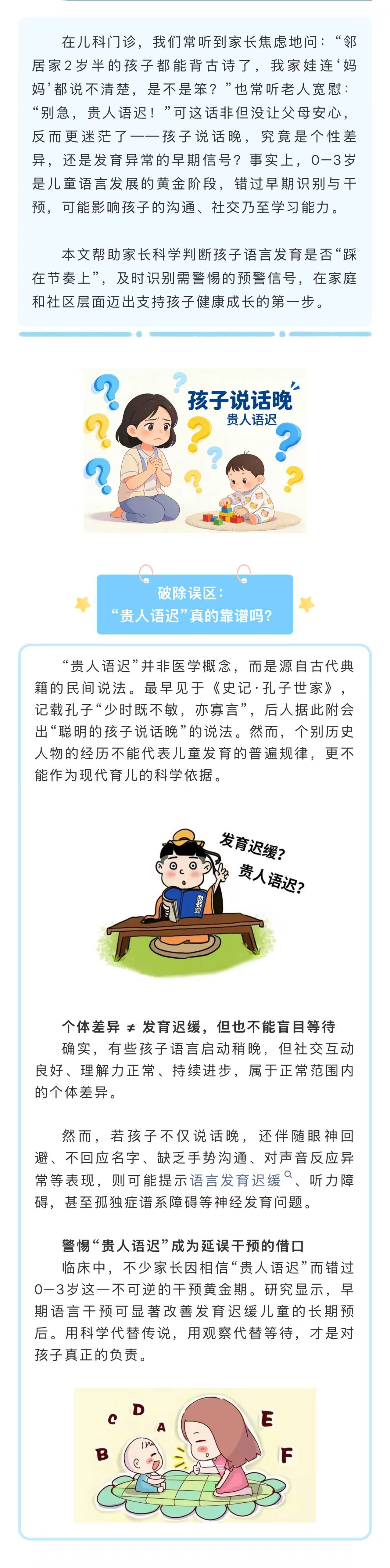 图文简介: 0–3岁是儿童语言发展的黄金阶段,错过早期识别与干预,可能影响孩子的沟通、社交乃至学习能力。本文帮助家长科学判断孩子语言发育是否“踩在节奏上”,及时识别需警惕的预警信号。
