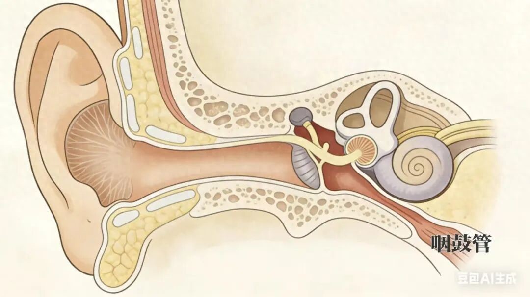 我们的中耳(耳朵鼓膜后面的部分)并不是一个封闭的空间,它通过一个叫作“咽鼓管”的细小管道与鼻咽部(鼻子最后面与喉咙相连的区域)相通。