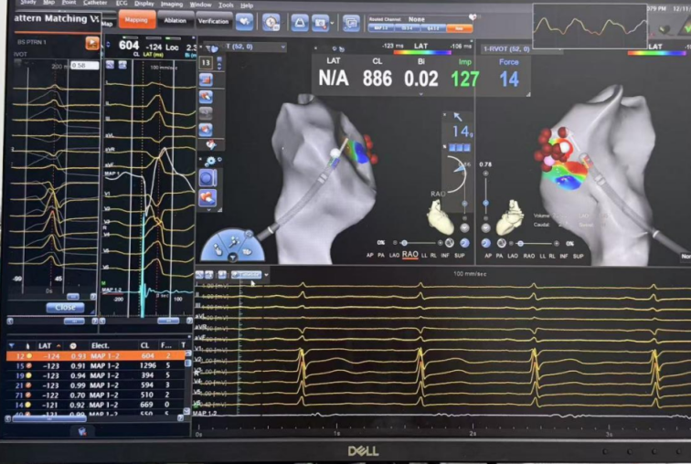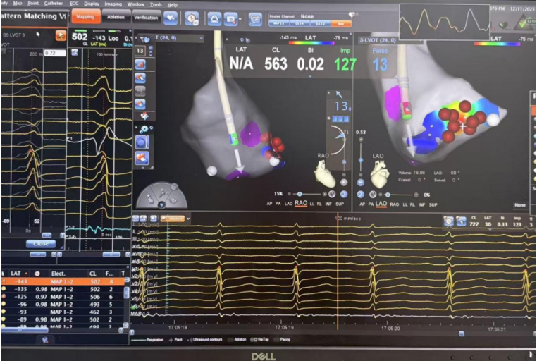 医疗团队依托三维电生理标测系统,如同为心脏绘制了一幅精准的“电路图”。术中敏锐捕捉到患者源自右室流出道、主动脉窦及左后乳头肌等多处病灶的异常电信号,并逐一进行精准消融。