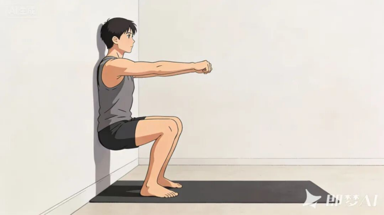 1.练好“肌肉护膝”:强化大腿前侧的股四头肌是关键。推荐靠墙静蹲:背靠墙,脚离墙一脚距离,缓慢下蹲至大腿与地面平行(膝尖别超脚尖),保持30—60秒,重复5~10组。