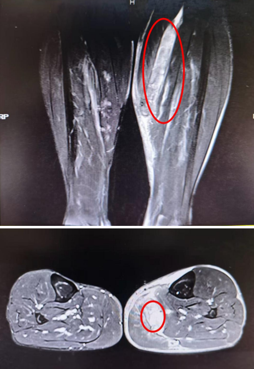 (▲核磁共振显示:腓肠肌内侧头撕裂,血肿形成。)