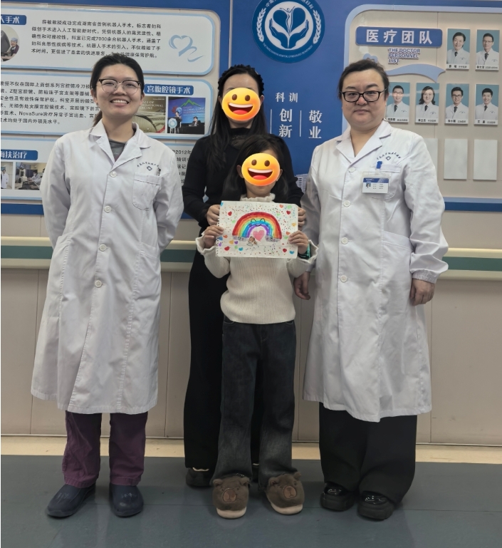 手术由孙信教授与李立杰主治医生共同主刀。团队仅在患儿脐部切开一道约1.5厘米的切口,通过单孔操作精准剥除囊肿,术中出血仅10毫升。术后脐部切口经整形缝合,完美隐藏于肚脐褶皱内,几乎看不出痕迹。患儿术后状态良好,为表达感激之情,用画笔绘出了美丽的彩虹送给医护人员。