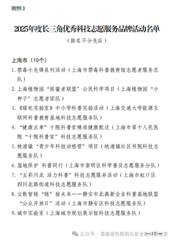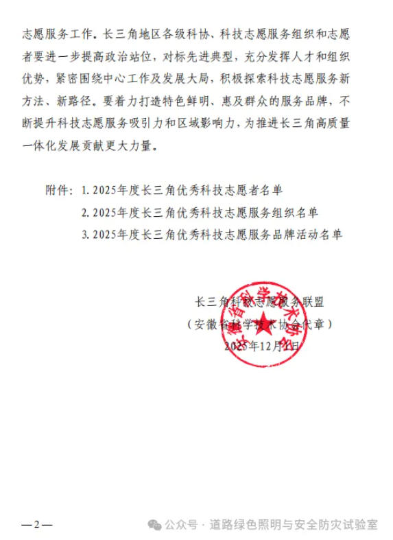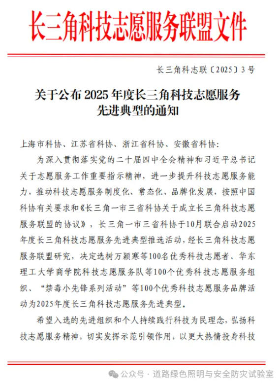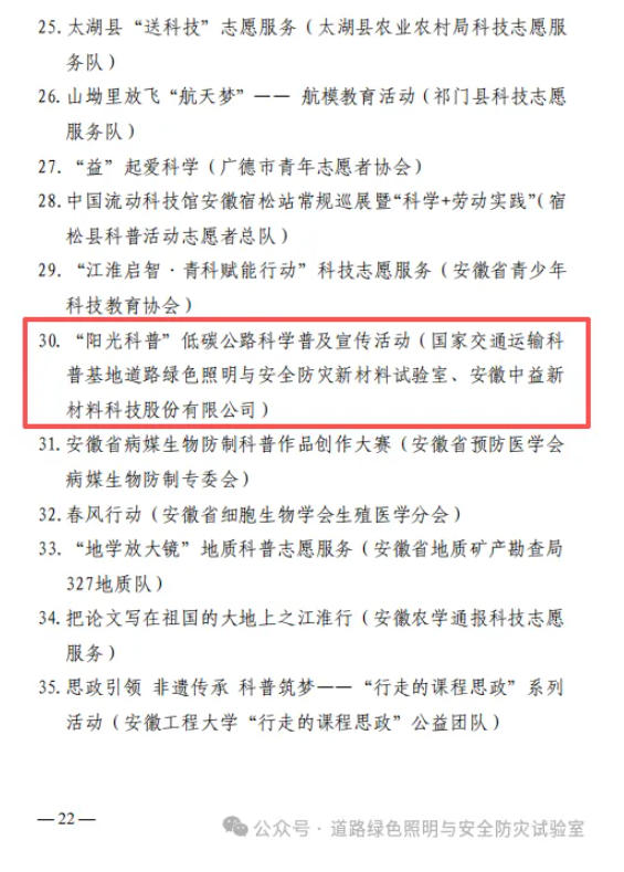 由国家交通运输科普基地——道路绿色照明与安全防灾新材料试验室、安徽中益新材料科技股份有限公司开展的“阳光科普”低碳公路科学普及宣传活动,成功入选“2025年度长三角优秀科技志愿服务品牌”。本次活动共评选出优秀科技志愿者、优秀科技志愿服务组织及优秀科技志愿服务品牌各100项。