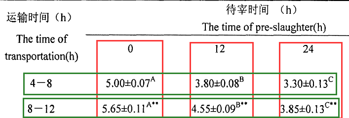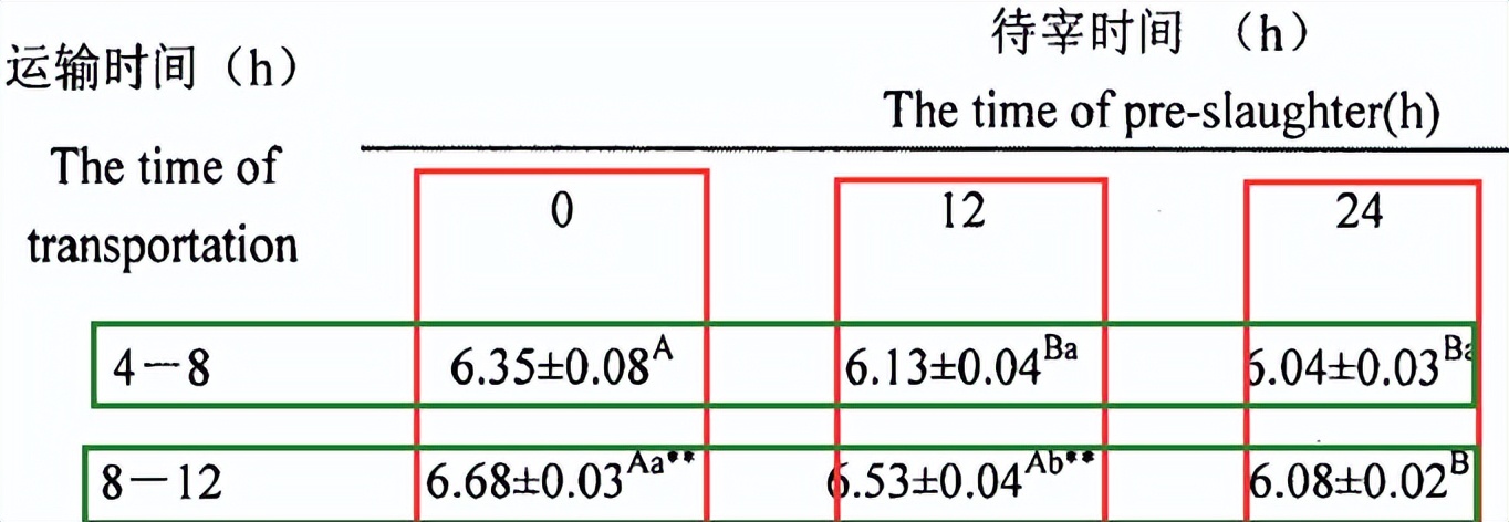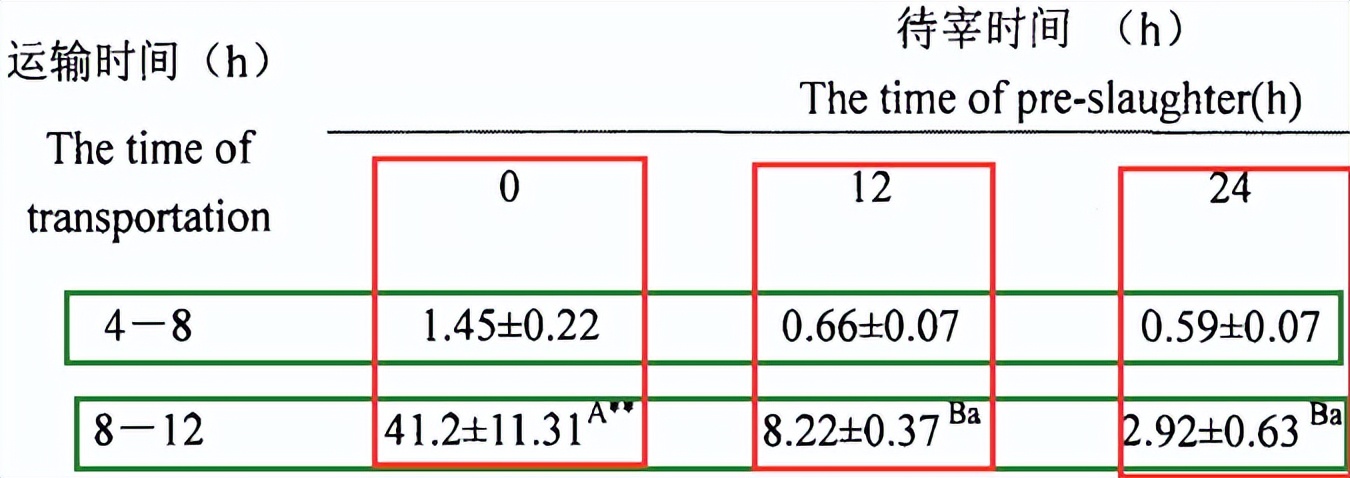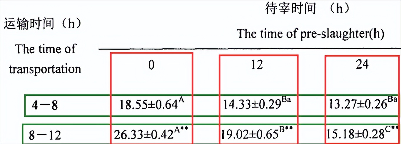 比较待宰时间:绿色色框—横向比——即运输时间不变,待宰时间影响。