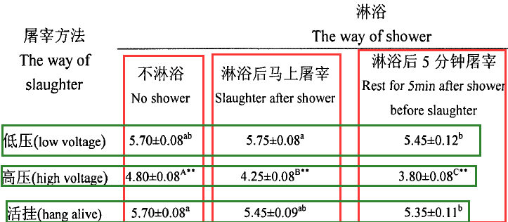 直接上结论:高压麻电屠宰的猪肉品质明显高于低压麻电和活挂。生猪宰前淋浴可极显著的改善猪肉品质