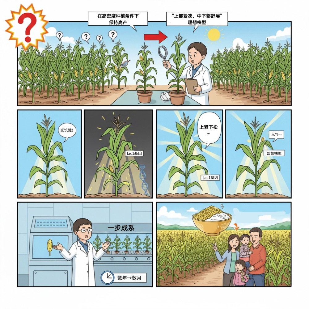 这一技术体系的建立改变了传统育种的“游戏规则”。以往利用分子标记辅助选择技术进行一个性状的定向改良,需要多代回交自交,往往耗时长达3-4年。而“一步成系”技术仅需一次杂交操作,在8–10个月内即可获得性状稳定、背景纯净的改良自交系,育种周期大幅缩短,效率显著提升。该技术不仅适用于株型改良,也为其他重要农艺性状的快速精准修饰、多性状协同改良乃至野生种的快速驯化提供了强大工具,标志着从基础研究到育种应用的完整闭环已经形成。