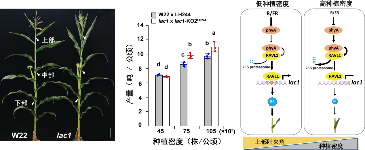 研究进一步揭示了lac1响应光信号、动态调控株型以适应密植的分子机制。在密植遮荫环境下,光信号通过光敏色素phyA和转录因子RAVL1的互作来调控lac1表达,使叶夹角随密度增加而减小。而在lac1突变体中,这一光信号通路被阻断,使得植株既能保持“上紧下松”的基础架构,又避免了过度的避荫反应,从而在密植条件下表现出更高的产量潜力。