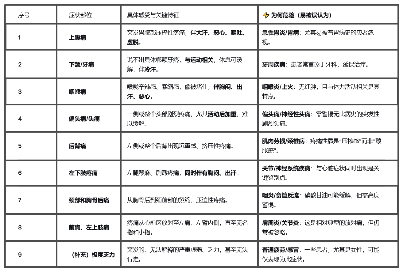 对于突发、原因不明、且伴有大汗/胸闷/恶心的剧烈不适,无论它出现在身体的哪个部位,都应首先警惕急性心梗的可能。
