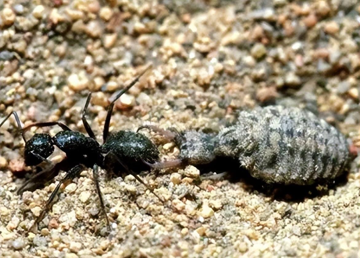 蚁狮在坑底用上颚牢牢钳住蚂蚁。(图片来源:百度)