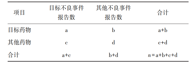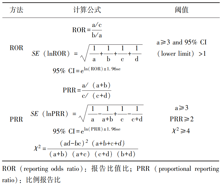 采用报告比值比(ROR)和比例报告比(PRR)法进行信号挖掘与统计分析。两种方法均基于比例失衡法中的四格表进行计算[6]。PRR法的阳性信号生成条件设定为:报告数≥3,PRR值≥2且χ2值≥4;ROR法的生成条件则为报告数≥3,且其95%置信区间(CI)下限>1[7]。为降低假阳性风险,最终认定的阳性信号须同时满足上述两种方法的判定条件。通常,PRR或ROR的数值越大,表明目标药物与不良事件之间的统计关联性越强,即信号强度越高。具体计算公式详见表1和表2。
