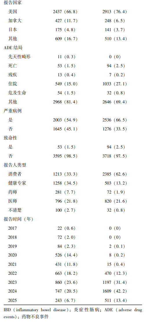 表3 乌司奴单抗和乌帕替尼治疗IBD的ADE报告基本信息[n(%)]