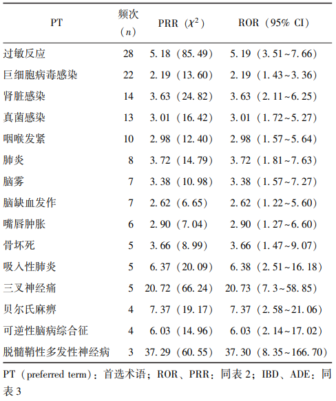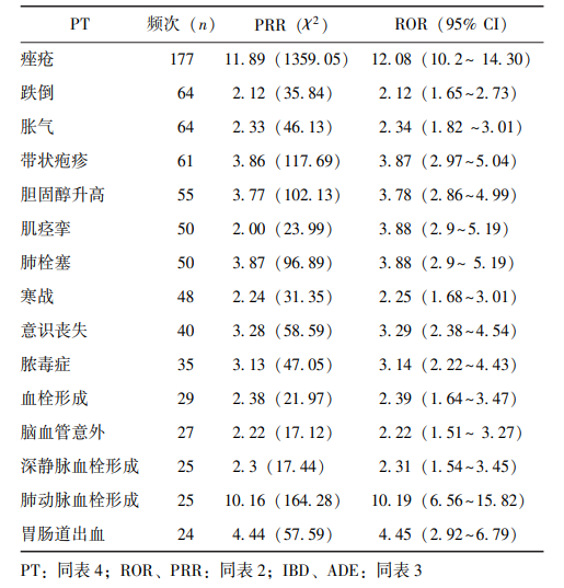 通过ROR与PRR联合检测法筛选出相关的ADE信号。在UST相关的高频ADE报告中,发生频率居前15位的依次为: