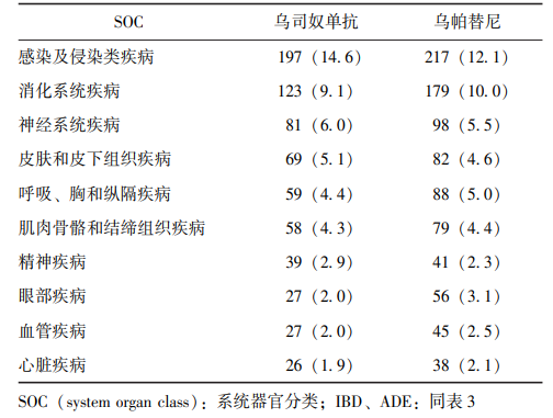 本研究结合公共数据库对UPA治疗IBD的不良反应信号进行挖掘分析,结果表明发生频率居前15位的ADE依次为痤疮、跌倒、胀气、带状疱疹、胆固醇升高、肌痉挛、肺栓塞、寒战、意识丧失、脓毒症、血栓形成、脑血管意外、深静脉血栓形成、肺动脉血栓形成、胃肠道出血。对阳性事件进行SOC归类后显示,发生频率较高的类别主要为感染及侵染性疾病、消化系统疾病、神经系统疾病、皮肤和皮下组织疾病、呼吸/胸/纵隔疾病。该发现提示,在临床实践中,除常规不良反应外,还需高度警惕如肺栓塞、脓毒症、各类血栓形成事件及脑血管意外等可能危及生命的严重不良事件。