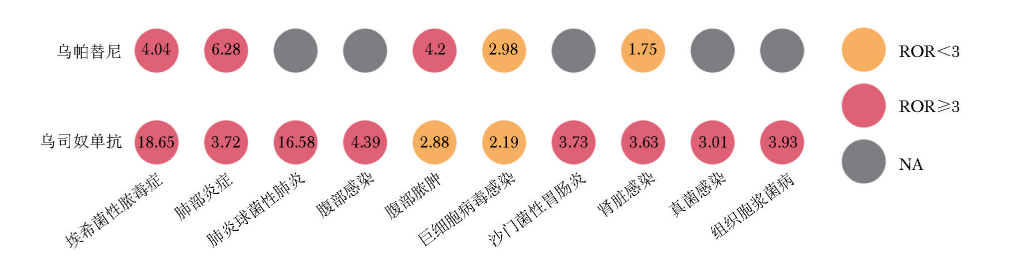 综上所述,本研究基于FAERS数据库分别对UPA和UST治疗IBD的不良反应信号进行了挖掘与分析,结果提示UST和UPA在治疗IBD时,需充分掌握适应证,识别高风险人群,并对患者用药后可能出现的感染、心脑血管疾病、深静脉血栓形成、肺动脉血栓形成及胃肠道出血等风险问题进行重点关注,同时加强感染及侵染性疾病、消化系统疾病、神经系统疾病及皮肤和皮下组织疾病等不良反应的监测和管理,定期评估药物疗效和安全性,以降低不良反应发生风险。本研究数据为未来两种药物联合应用提供了更加全面的安全性信息。