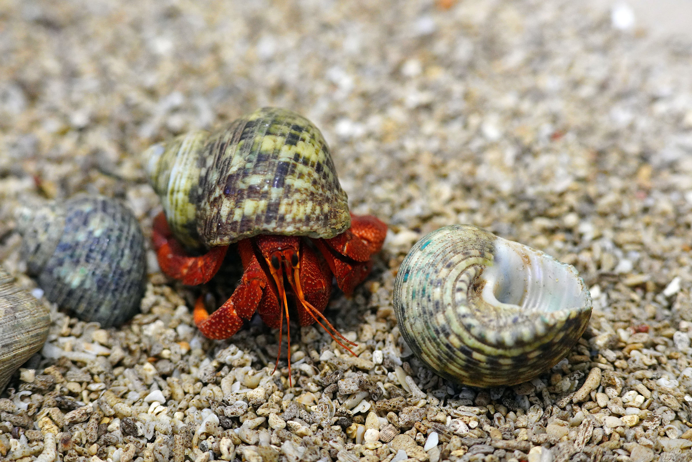 寄居蟹的“偷梁换柱”是一场精密操作。它并不总是等待海螺自然死亡留下空壳,更多时候会主动出击。凭借敏锐的触觉和视觉,寻找大小合适、结构完整的活体或新近死亡的海螺。对于活体海螺,它会评估对方防御能力。面对小型或反应迟缓、防御较弱的,可能用螯钳骚扰、敲击,甚至撬下,迫使其缩回壳内,再伺机而动。有时直接拖出或吃掉,从而“偷”得新“梁柱”。随着身体生长,旧壳不再适用,寄居蟹会在海滩上巡查,用螯足测量和探查空螺壳,寻找“理想户型”。找到更好的新壳时,不会立即丢弃旧壳,而是先检查,然后迅速脱出旧壳,尽管短暂暴露腹部危险,但会快速钻入新壳。这可能引发连锁反应,遗弃的旧壳可能被其他寄居蟹看中,形成一连串“换房”景象。若新壳被占,可能发生“壳斗”,更强壮或执着的一方获胜,实现强制性“换柱”。有时多只寄居蟹会围绕优质空壳形成“评估队列”,轮流试用、交换。