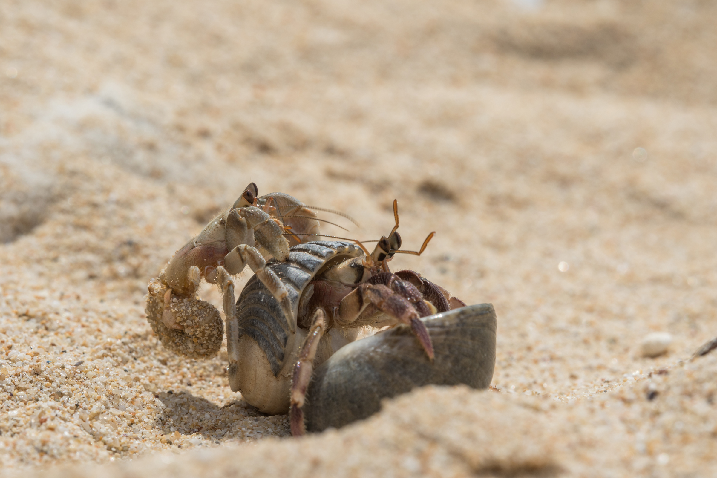 寄居蟹会主动攻击活体海螺以获取新壳。它们也会从其他寄居蟹那里抢夺。它们对新壳的渴望,驱动着持续的资源勘探和竞争行为。离开旧壳、暴露柔软腹部钻入新壳的短短几秒钟,是寄居蟹生命中最脆弱的时刻。它们必须快速判断新壳是否真的更好,包括空间、重量、完整性,以及周围环境是否安全。这个决策过程充满了风险计算。优质螺壳是稀缺资源。寄居蟹之间为争夺理想壳体的打斗非常常见。它们会用螯钳猛烈敲击对手的壳,试图将对方震晕或吓退;也会互相推挤,试图将对方从壳中拉出。这种争斗可能持续很久,直到一方放弃或更强大的外力介入。“换壳链”现象表明,寄居蟹群体中存在一种基于壳的大小的、近乎本能的“换房”秩序。这可以被视为一种简单的“市场经济”或“社会协作”,能提高整个群体对壳资源的利用效率。