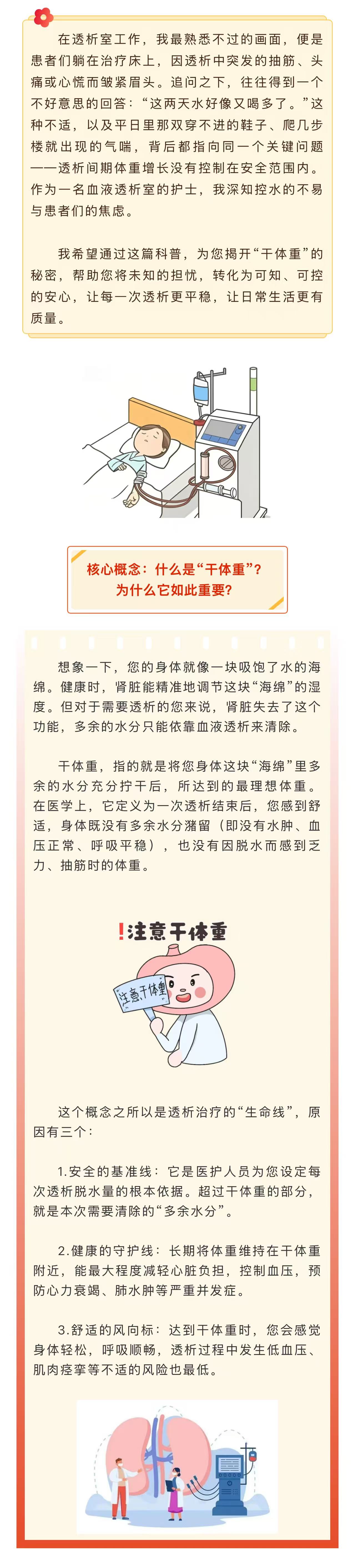 图文简介: 我希望通过这篇科普,为您揭开“干体重”的秘密,帮助您将未知的担忧,转化为可知、可控的安心,让每一次透析更平稳,让日常生活更有质量。
