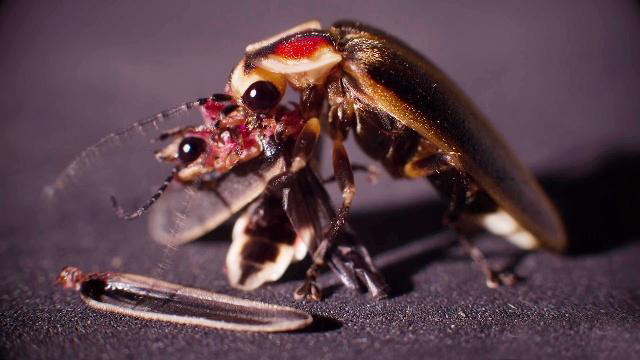 一只受骗的雄性萤火虫降落后,被伪装成“美人”的捕食性雌虫迅速攻击并捕食。(图片来源:百度)