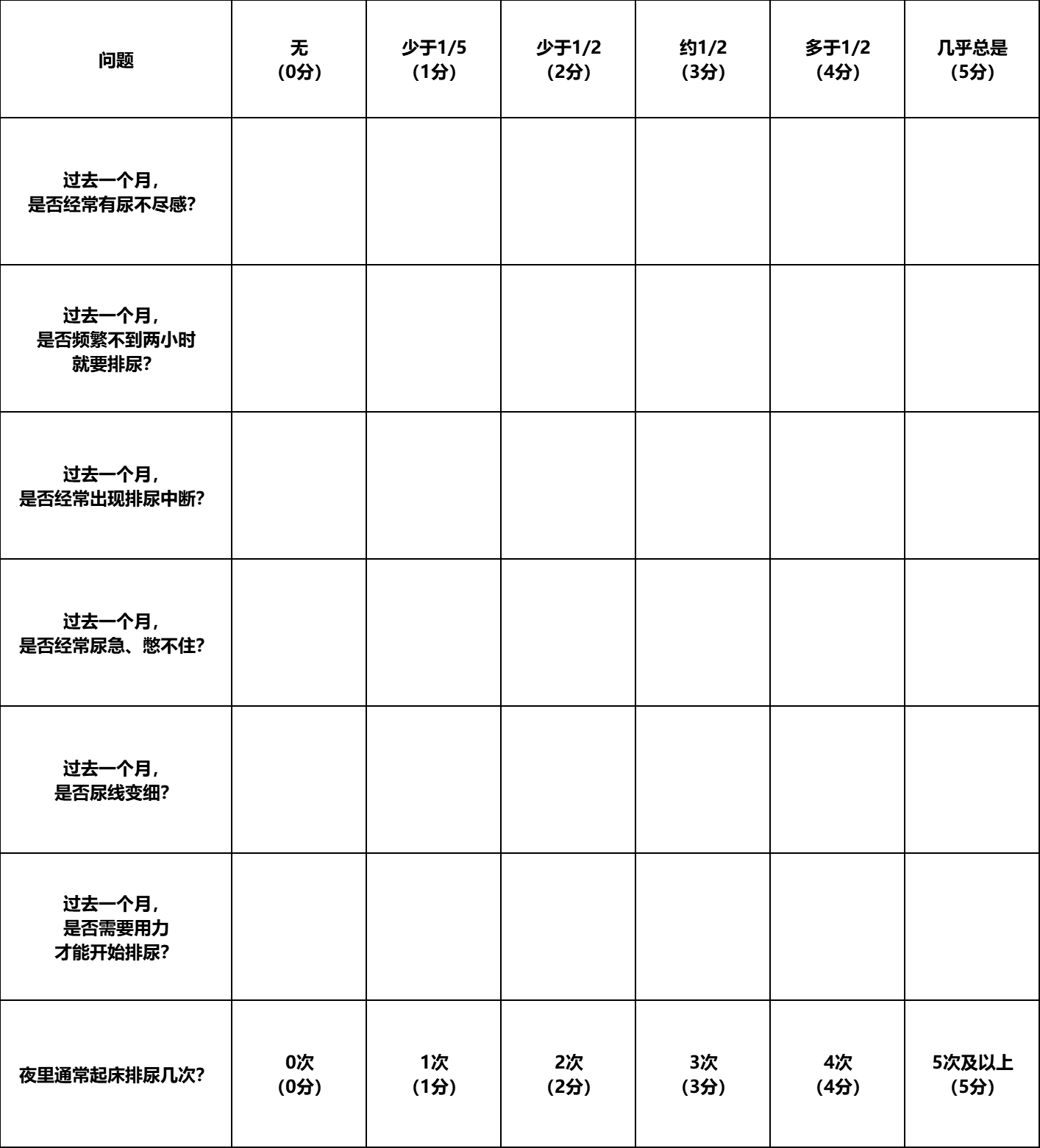 这是国际公认的、评估排尿症状(尤其对于中老年男性前列腺增生)的黄金标准。它通过7个问题,将您的主观感受转化为具体的分数。