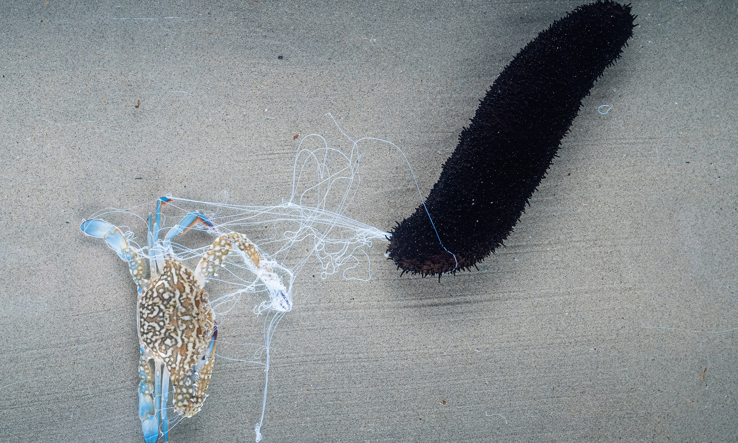 一只梭子蟹被海参喷出的居维氏管所吸引、缠绕,放弃了追击海参本体。(图片来源:百度)