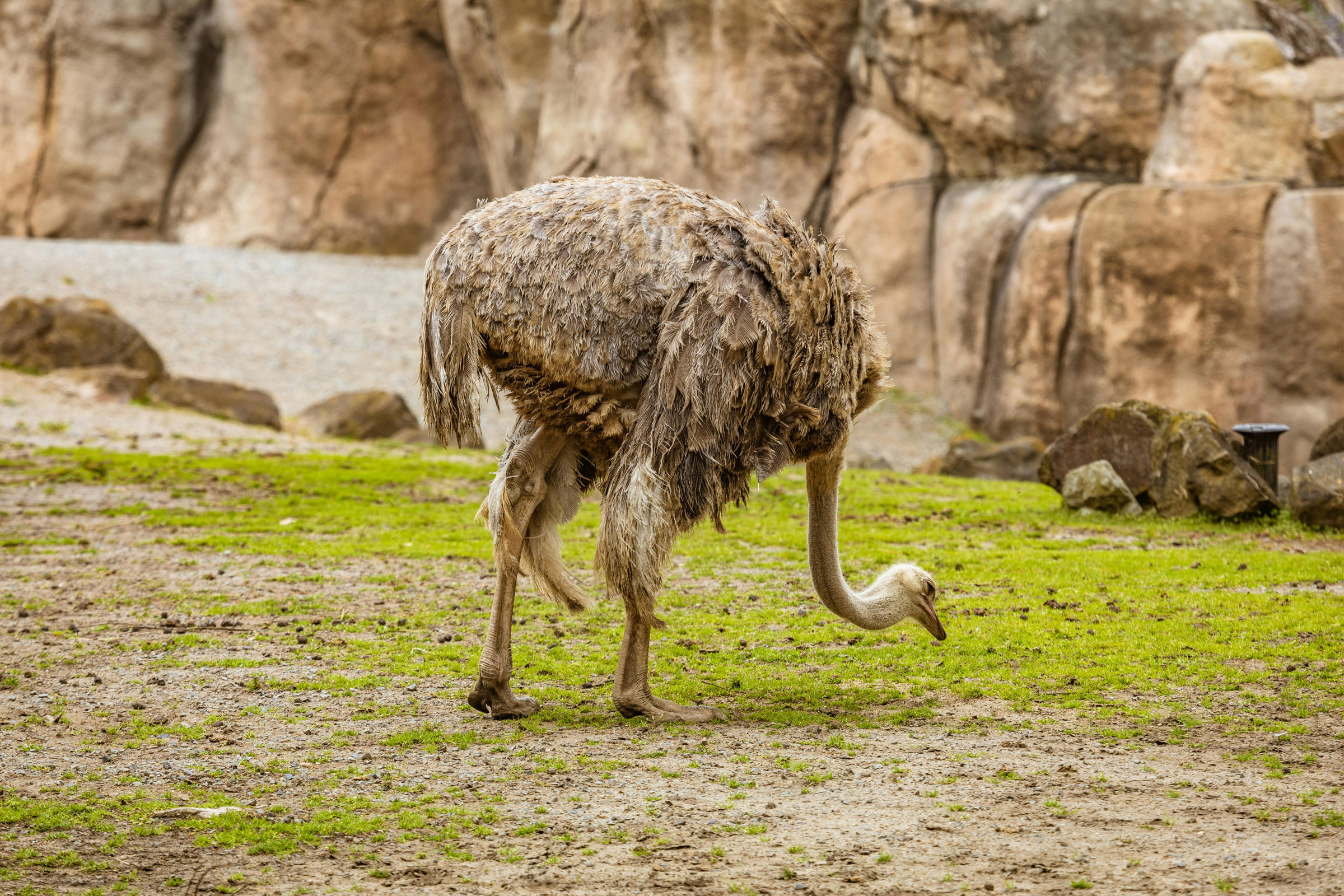一只鸵鸟低头啄食地面食物,这是正常觅食行为,却被误解为“把头埋进沙子里”。(图片来源:Pexels)