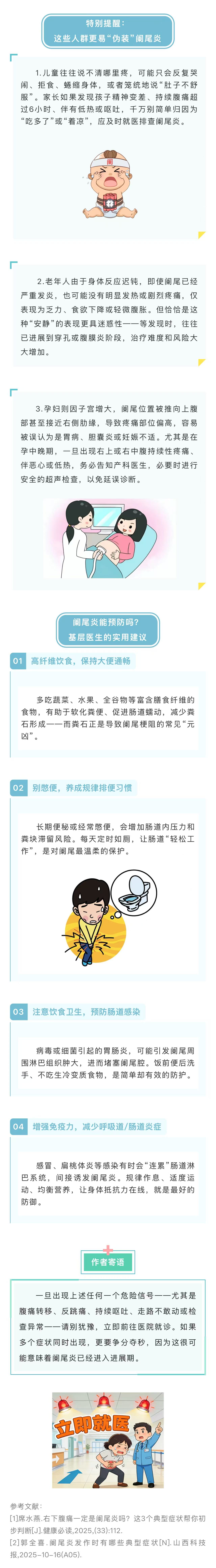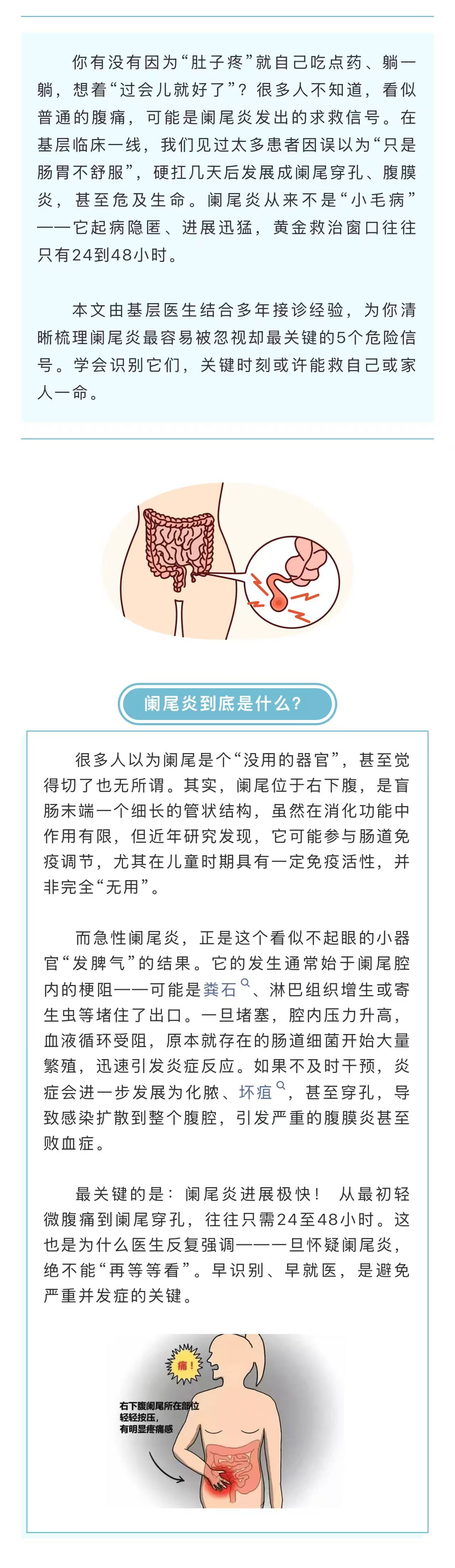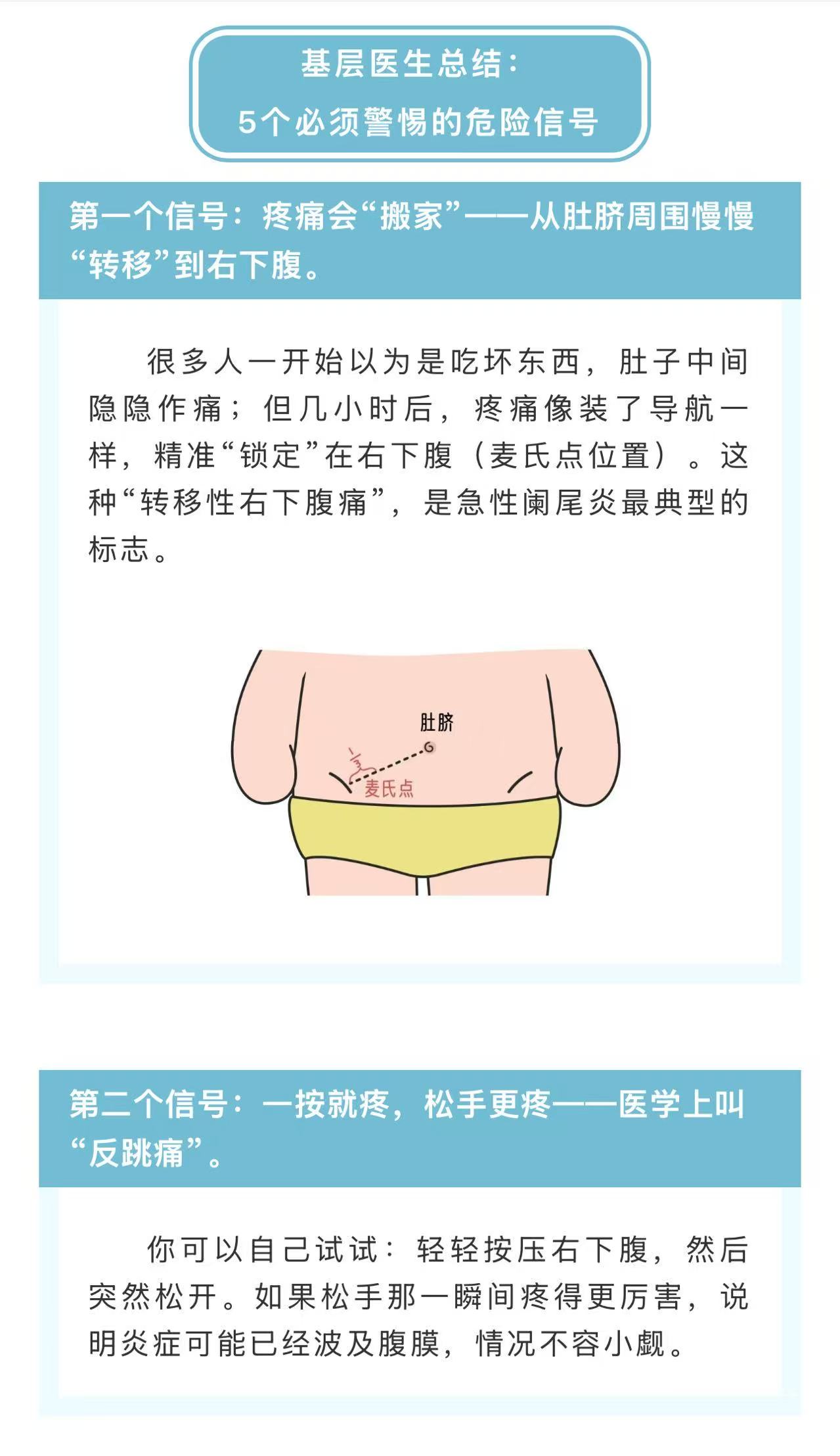 图文简介: 本文由基层医生结合多年接诊经验,为你清晰梳理阑尾炎最容易被忽视却最关键的5个危险信号。学会识别它们,关键时刻或许能救自己或家人一命。