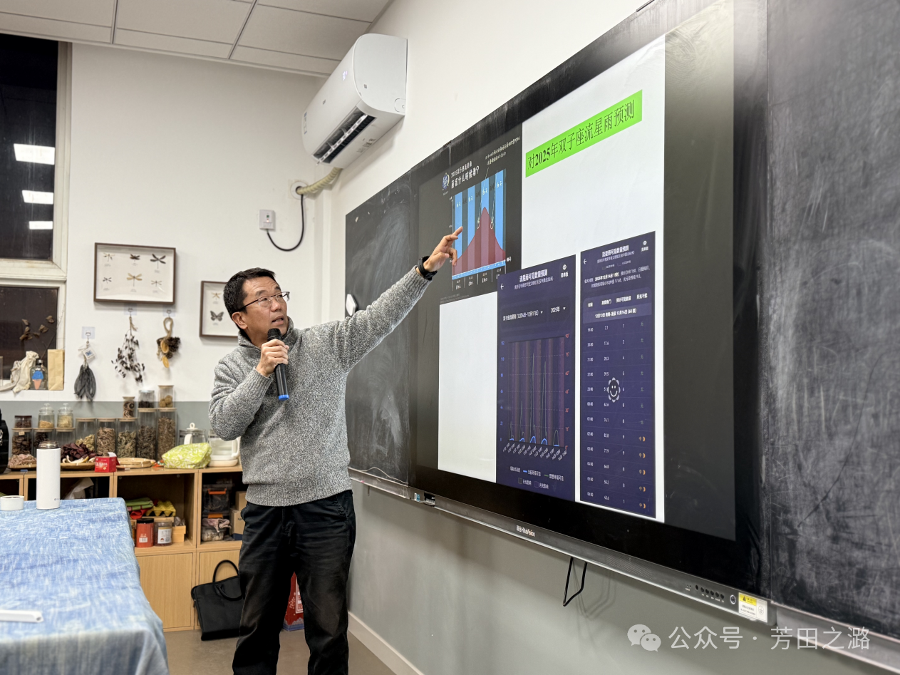 活动伊始,我们特别邀请天津市天文学会理事长、南开区政协委员阎为国老师为大家带来了一场生动有趣的流星雨主题讲座。阎老师从“什么是流星”导入主题,深入浅出地讲解了双子座流星雨的成因、观测技巧及相关天文知识,为参与者打开了通往宇宙奥秘的大门。将复杂的宇宙现象变得生动有趣,让每位参与者都沉浸在天文知识的海洋中,为后续的观测活动奠定了坚实的理论基础。