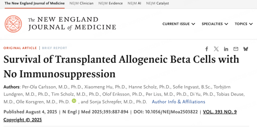 2025年8月4日,瑞典乌普萨拉大学等机构研究人员在《新英格兰医学杂志》发布重磅研究,全球首次运用基因编辑改造的异体胰岛β细胞,成功治疗了一位37年病史的1型糖尿病患者。