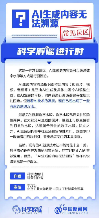 真相:这是一种常见误区。AI生成的内容是可以通过数字水印等方式进行溯源的。
