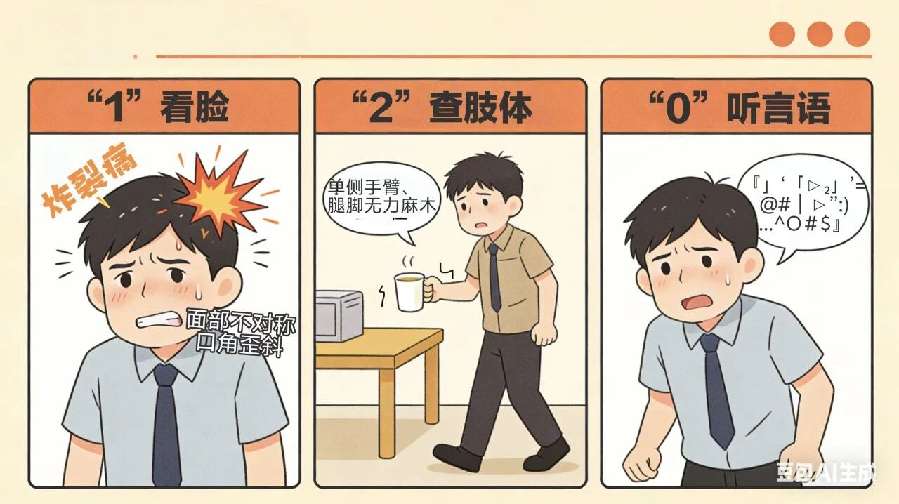 “1”看脸:面部不对称,口角歪斜,可能伴有剧烈头痛(像“炸裂样”痛)。
