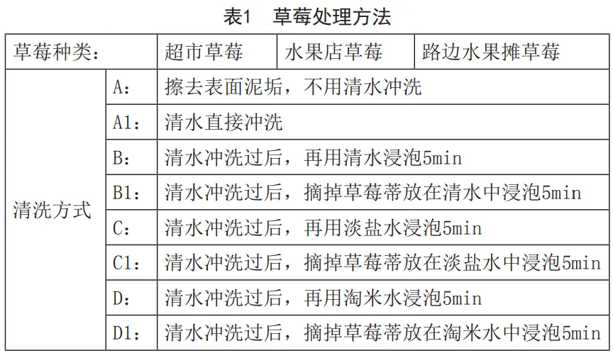 研究人员选取了具有代表性的草莓分别都取自超市、水果店、路边水果摊各 3千克,平均各分成8份,分别进行了下图表中8种清洗方式,对比不同清洗方式对草莓样品中农残的影响。