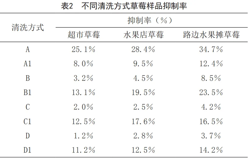 实验结果发现:摘掉草莓蒂和不摘掉草莓蒂在去除农残方面有着明显的区别,摘掉了草莓蒂后再浸泡的草莓,农残相对来说更高一些。