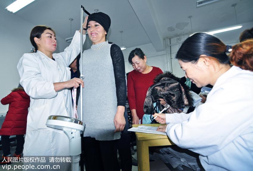 2016年12月3日,五师双河市医院的医护人员在给基层的维吾尔族群众测量身高体重。(潘广发/人民图片)