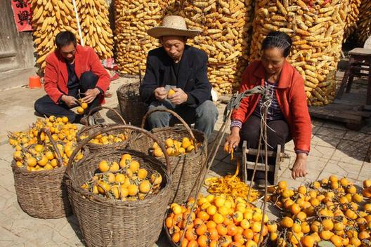 山西省晋城市阳城县演礼乡梁庄村农民将收获的柿子整理、削皮(图片来源:新华社)