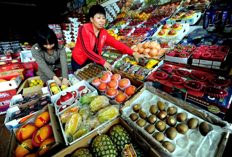 营销人员在厦门市中埔台湾水果销售集散中心整理货架(图片来源:新华网)