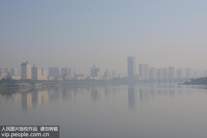 2016年10月13日,雾霾笼罩下的吉林省吉林市松花江畔。当日,受冷空气影响,吉林市松花江畔出现雾霾天气,江边建筑笼罩在一片雾霾当中若隐若现。(王明铭/人民图片)