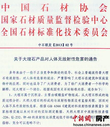 关于大理石产品对人体无害的通知(图片来源:中新网)