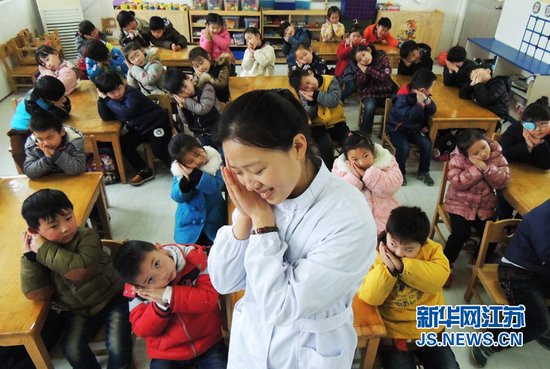 医护人员为幼儿园小朋友示范讲解正确的睡眠姿势。(图片来源:新华网)