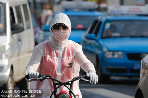 资料图:2016年7月21日,江苏连云港赣榆区街头,人们做好防晒措施在高温中出行。(司伟/人民图片