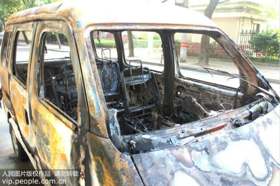 2013年8月1日,浙江省台州经济开发区某路段一辆停放在路边的面包车发生自燃,车体烧成空壳。(何文斌 赵健/人民图片)