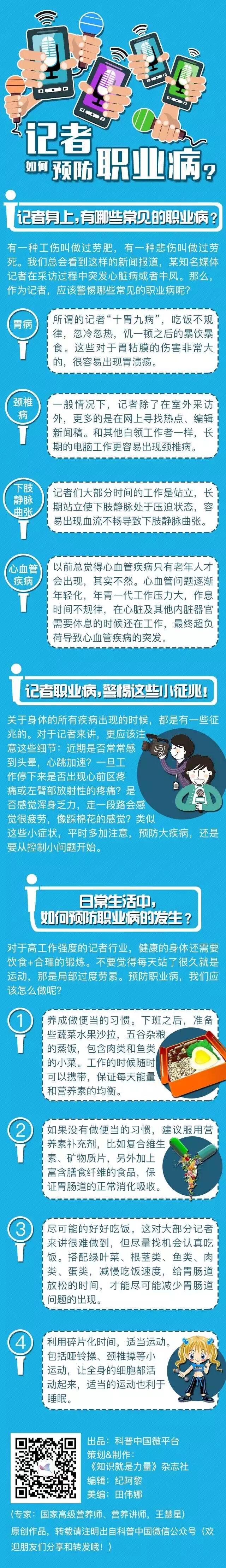 (专家:王慧星,国家高级营养师、营养讲师,科普中国微平台原创首发)今天,记者节,一个不放假的工作节日。平时,我们看到的记者是多面的,感动的、敬业的,当然也有一些负面情况等等。但记者其实是很辛苦的职业,