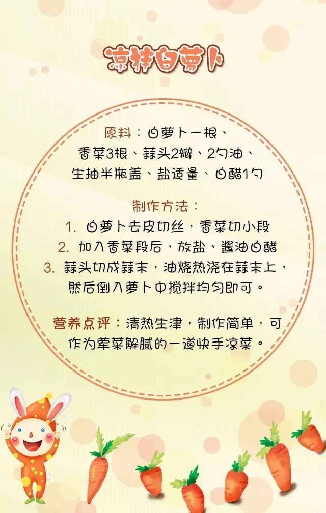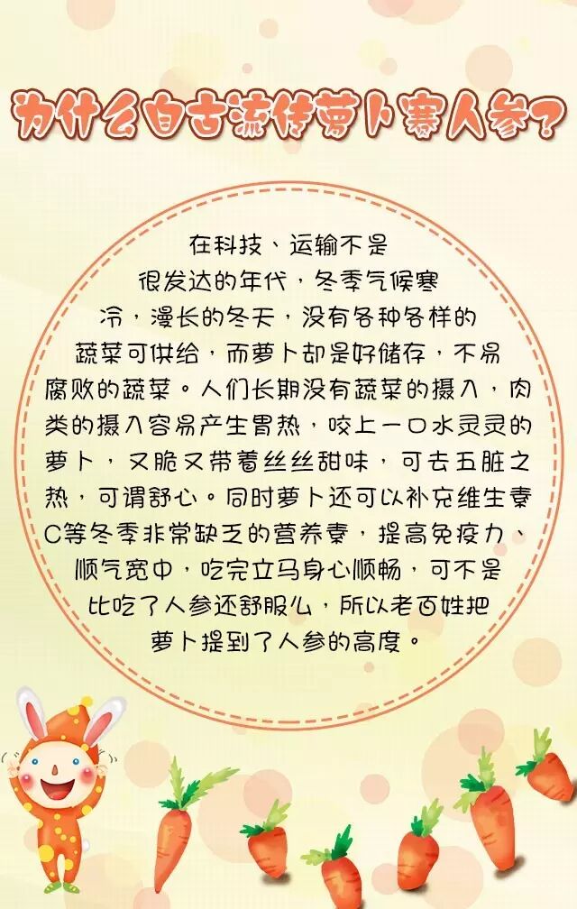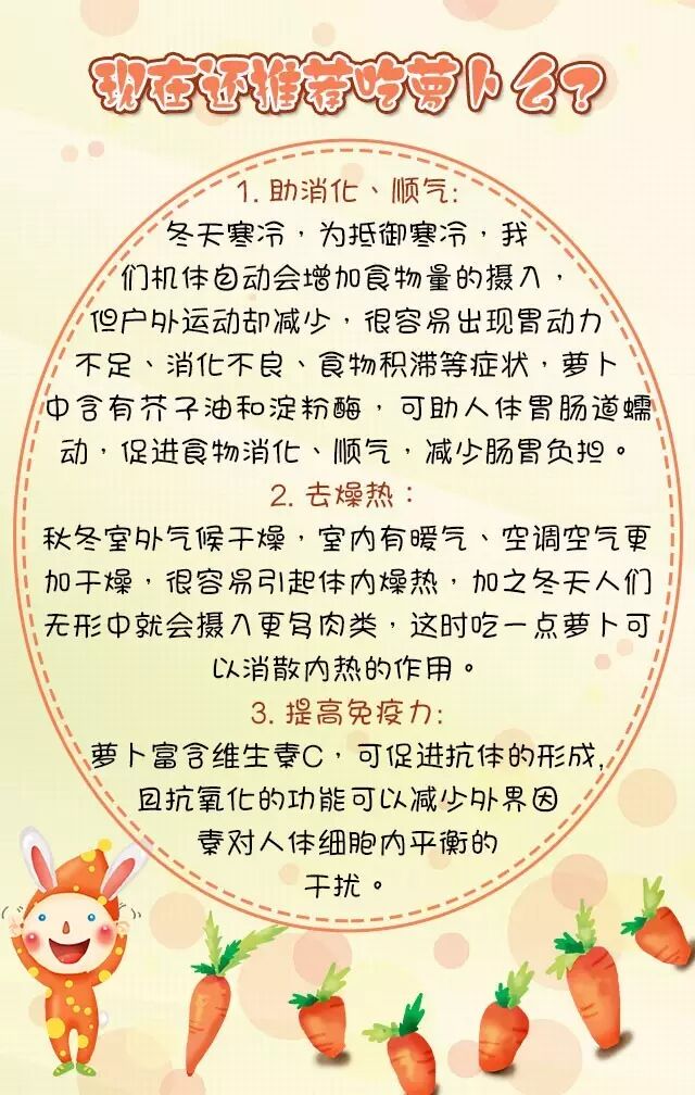 “多吃萝卜少吃药”、“十月(农历)萝卜小人参”,萝卜的营养价值在我国从古至今的饮食文化中一直有着不可动摇的地位。一到冬天萝卜便被大家放进了菜篮子,成了老百姓餐桌不可缺少的食疗佳品。萝卜食用方法众多,可用于制作菜肴,又可当作水果生吃。所以,冬天不妨多吃点萝卜,对健康是很有好处的。