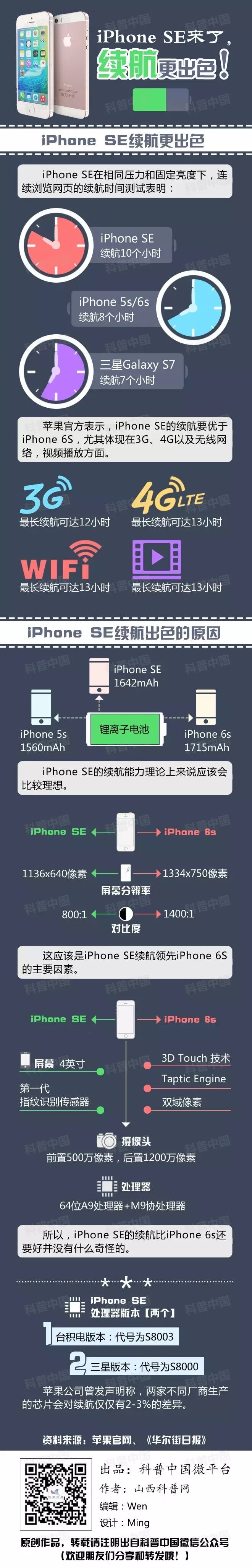 上周苹果公司在春季新品发布会上为我们展示了一款4英寸的智能手机iPhone SE,有人评价iPhone SE的造型跟iPhone 5s相差无几,而它的配置则跟iPhone 6s同属一个级别,性价比较高。不过对于一款智能手机来说,续航力是影响用户使用体验的一个非常重要的因素。据媒体报道,将手机调节至同样的亮度水平,iPhone SE的续航时间可达10小时,较iPhone6s要长2个多小时。今天,我们不谈颜值,说点实在的,一图了解iPhone SE的续航力为什么更强。