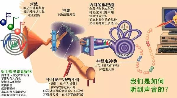 人的听觉器官由外耳、中耳和内耳的耳蜗组成。声源振动引起空气产生的疏密波,通过外耳和中耳组成的传音系统传递到内耳,经内耳的换能作用将声波的机械能转变为听神经纤维上的神经冲动,后者传送到大脑皮质的听觉中枢,就产生了听觉。