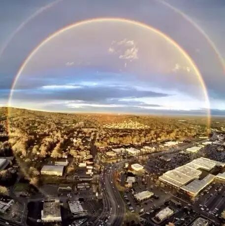 想看看360度的彩虹是什么样的吗?只要你的视野不被地面遮挡到,就能看到完美的彩虹圆弧。找到一个足够高的欣赏位置吧。