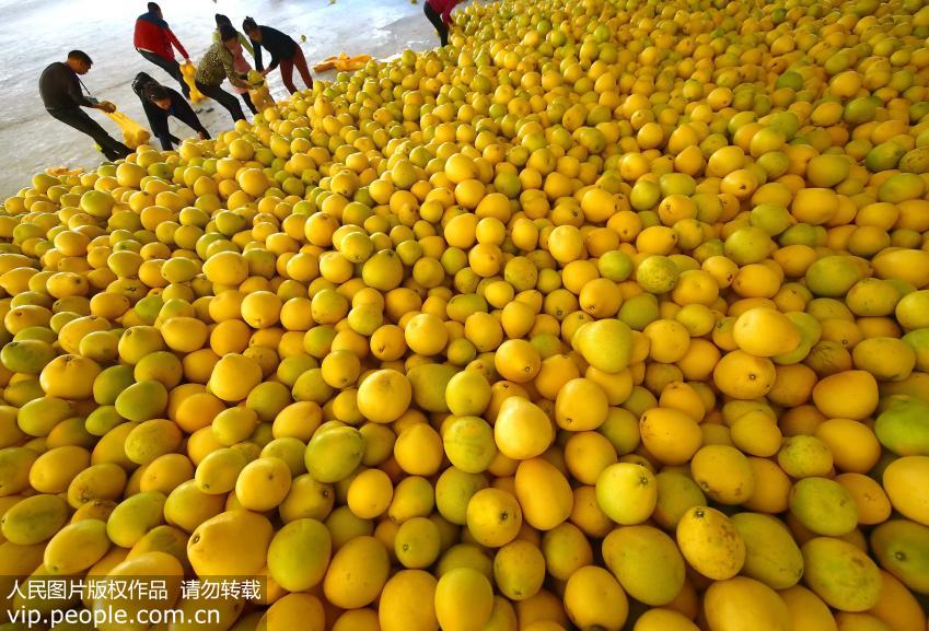 2016年11月12日,在湖北省宣恩县高罗镇九间店村一“贡水白柚”产销合作社,柚农在存放收获的柚子。(宋文/人民图片)