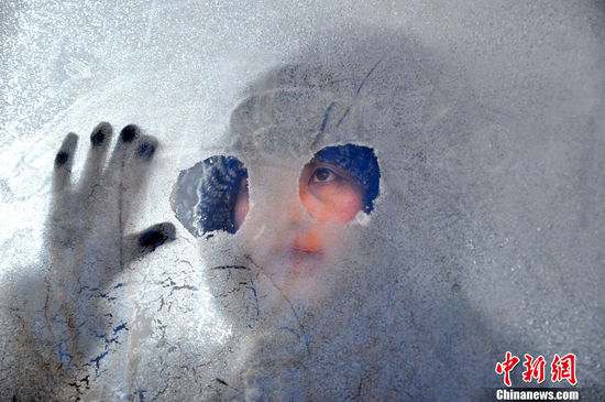 内蒙古呼伦贝尔市牙克石,一位居民在透过结满冰霜的窗户向外张望。(图片来源:中国新闻网)
