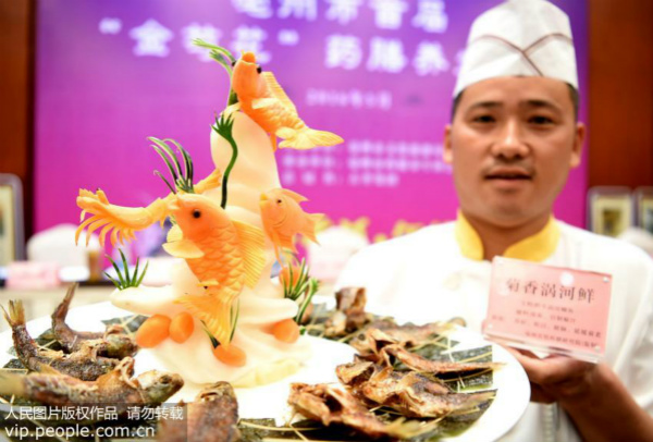 安徽省亳州市举办的药膳养生大赛上,一位选手在展示自己的作品。(刘勤利/人民图片)